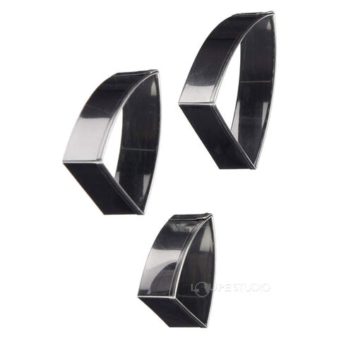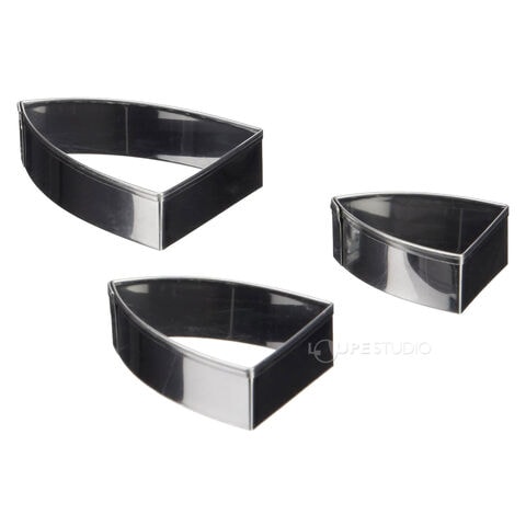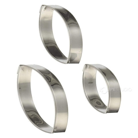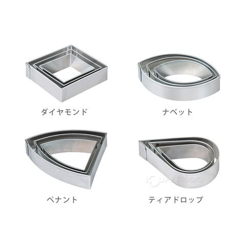 金属製のフィモ用クレイカッターです。ダイヤモンド型、ナベット型、ペナント型、ティアドロップ型で、それぞれ4cm /5cm /6cm の3サイズがセットされています。アクセサリーや雑貨づくりに役立ちます。