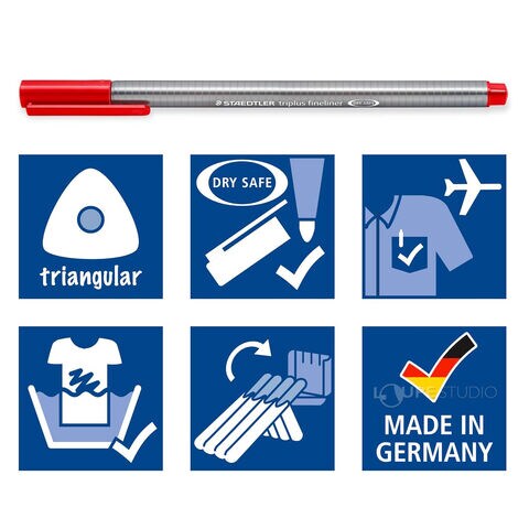 自然と指にフィットし持ちやすく、書きやすい三角ボディ"トリプラス"の細書きカラーペンです。発色の良い独自のインクは、空気に触れるとペン先に薄い皮膜をつくり、キャップを閉め忘れても約2日間であればペン先の乾燥を防ぎます。ペンスタンドになる便利なケース"ステッドラーボックス"入りです。