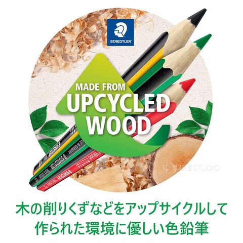芯・軸・塗料の材料を個々にチップ状に加工し、独自開発した機械で一気に鉛筆の形に押し出し成型しています。今まで大きさが足りず廃棄してしまっていたような、木材の端材などの材料を、チップ状にすることによって原料となる木材を活用し、無駄を限りなく減らしています。ステッドラー独自のアップサイクル製法で、究極のエコな色鉛筆に仕上げています。