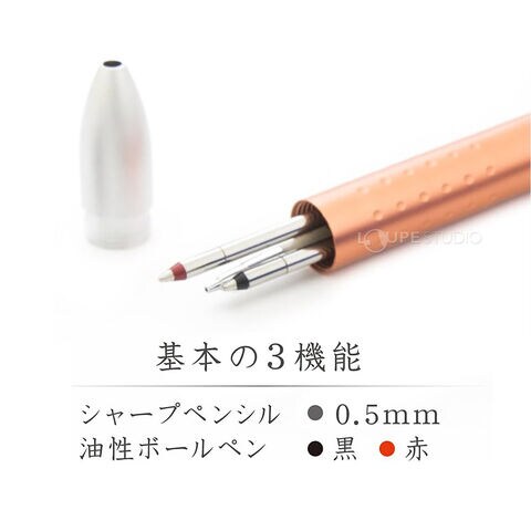 わずか14gと非常に軽く、携帯性に優れた3機能ペンです。手帳や胸ポケットにすっきりと収まるコンパクトでスタイリッシュなボディと豊富なカラーバリエーションで男女問わず人気のデザインです。黒/赤ボールペンと0.5mmのシャープペンシルと基本の3機能を備えています。ティアドロップ型のディンプル(型押し)やプラチナプレート加工が機能性と優雅さを演出しています。
