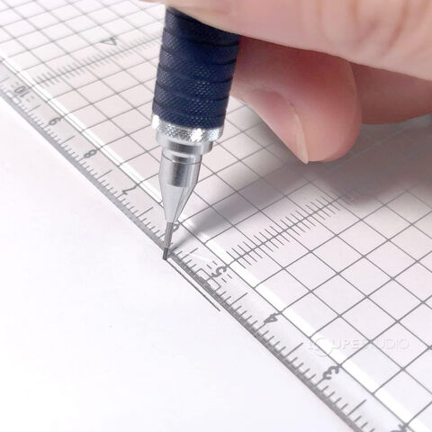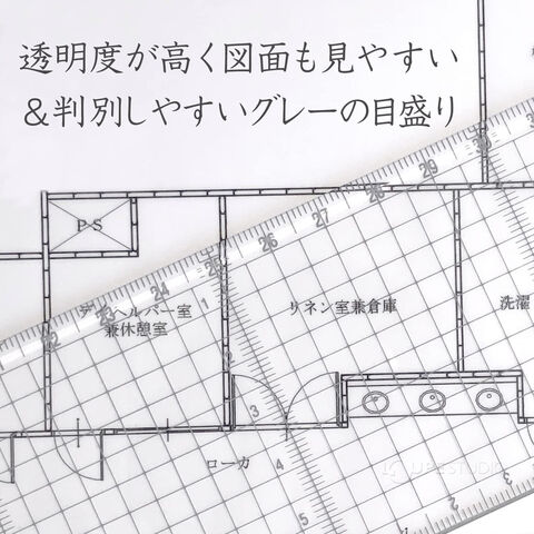 グレーの目盛りは、濃い紙の上でも読みやすいアクリル製の40cm定規です。鏡面仕上げを施しているため、傷つきにくくなっています。本体の厚さは3mmです。また5mm方眼と1mm点線平行目盛りが付いています。