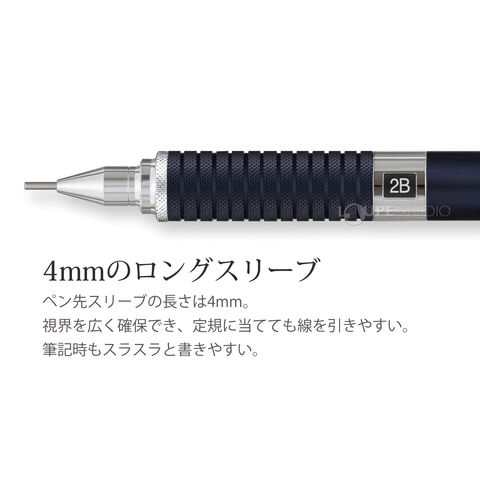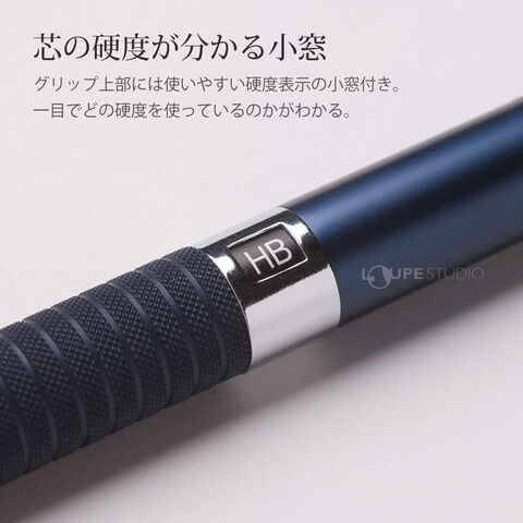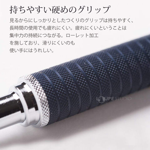 多くのプロフェッショナルから信頼を得ている製図用シャープペンシルです。落ち着きのあるボディカラーは男女問わず人気です。アルミ製ボディで耐久性に優れています。グリップ部の滑り止め加工により、指にフィットし安定した筆記感を生み出します。また4mmと長いペン先を採用しており、書いている文字や線が見やすいうえ、定規に当てて線を引く際は補助となるため、製図・筆記を問わず快適な使い心地を提供します。硬度表示窓付きで、芯の硬度も簡単に確認できます。
