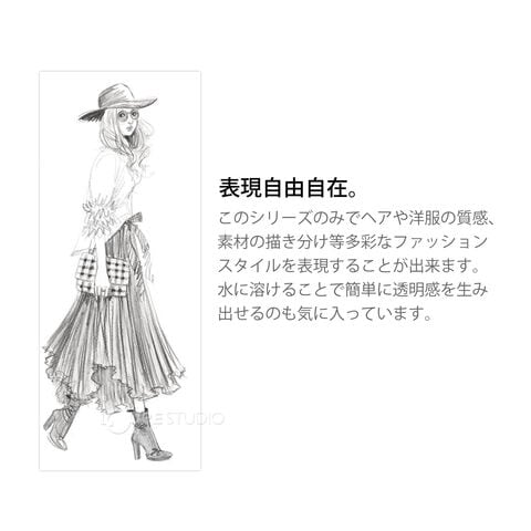 描いた後に水でなぞることで水墨画のような表現が楽しめる"水彩鉛筆"です。8Bと6Bが2本、4B×1本と8号の筆がセットになっています。描いた部分を水を含ませた筆でなぞると溶けるので、グラデーションや陰影の濃淡が簡単に表現できます。濡れた紙への描き込みや乾いてから再度溶かすこともでき、線画をなぞるだけでプロのような雰囲気のある表現が楽しめ、これまで以上に表現の幅を広げてくれるツールです。