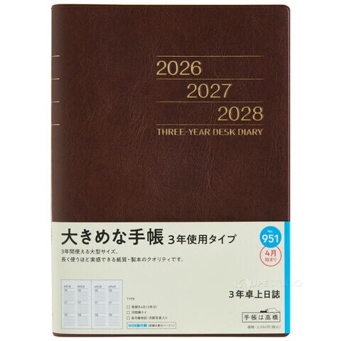 - 3年分の記録を書き込める連用ダイアリー。横ケイ式の月間ページは3年分の予定が一覧でき、ビジネスや年間行事などの管理に役立つ一冊です。長年使い続けられるよう、耐久性にも優れた商品です。シックなブラウンのカバーで、ビジネスにもプライベートにも馴染む1冊です。