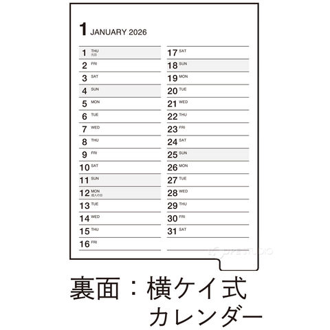 裏面は長期的な予定や進捗の管理に便利な横ケイ式カレンダー。実用的でありながらも、両面で使い用途が広がるデザインです。エコで地球にやさしい、シンプルな壁掛・卓上兼用タイプのカレンダー[B6サイズ×2面]