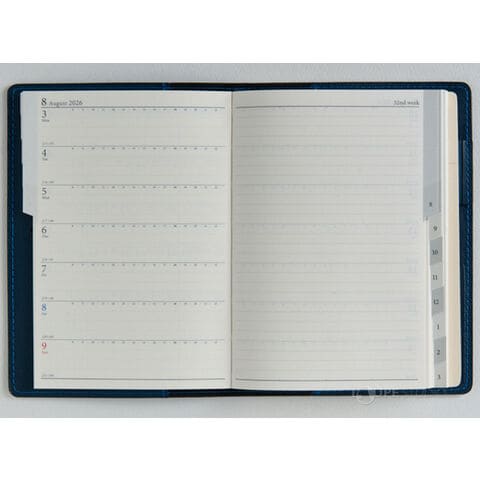 左ページは1週間分のスケジュール欄、右ページは横罫メモのレフト式。スケジュール欄には時間目盛りも付いているので、時間ごとの予定もしっかり管理できます。