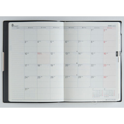 カレンダーと同じ感覚で見ることができ、週ごとの予定が把握しやすいブロック式。平日の仕事の予定や、週末土日の予定をまとめて書きやすい月曜始まり。左端の一列はフリーのメモ欄になっています。月ごとに月間と週間が配置されているので、1ヵ月単位での管理が便利です。