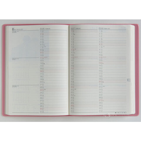 長期プロジェクトを管理しやすい見開き1ヵ月×3年分の横罫式カレンダー。記入スペースが横に長いので記入がしやすく、一覧性に優れています。3年分掲載しているので、年ごとのスケジュールが比較しやすいです。左側にはフリーのメモスペース付きです。