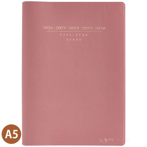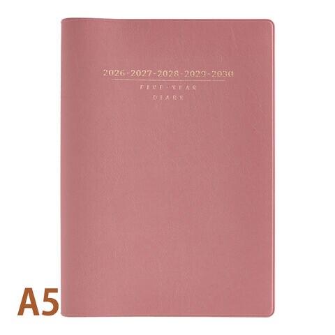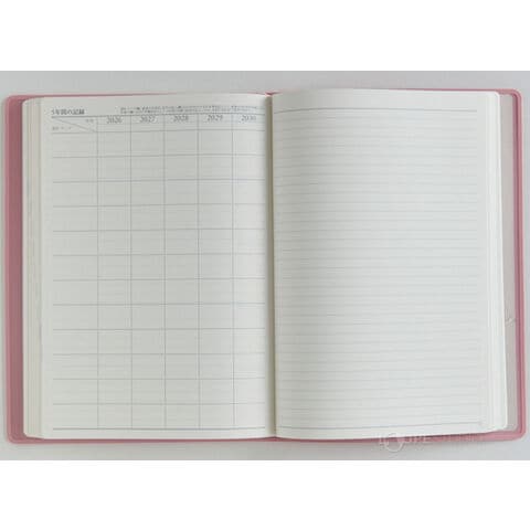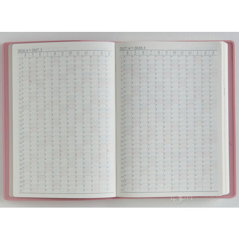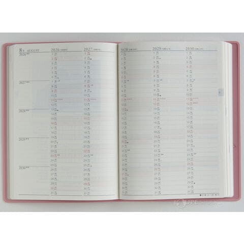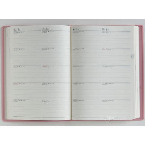 長期プロジェクトを管理しやすい見開き1ヵ月×5年分の横罫式カレンダー。記入スペースが横に長いので記入がしやすく、一覧性に優れています。5年分掲載しているので、年ごとのスケジュールが比較しやすいです。左側にはフリーのメモスペース付きです。