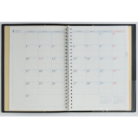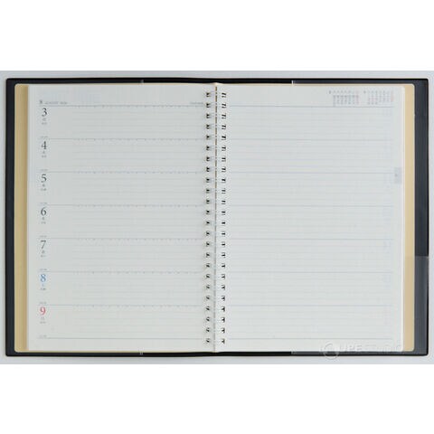 左にスケジュール、右に横罫メモが付いているベーシックなレフト式。スケジュール欄には時間目盛りが付いているので、複数の予定管理にも便利。メモスペースには会議の内容をメモしたり、思いついたことを書き込んだり、自由な使い方ができます。