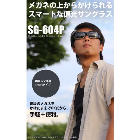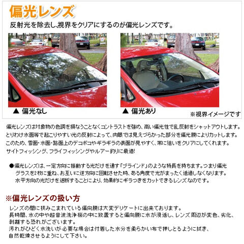 | 仕様 | UV400プロテクション(紫外線カット99%) 可視光線透過率(17%) ブルーライトカット率(80%) 偏光レンズ(TAC/パノラミックビューレンズ) 硬質ナイロンフレーム(TR-90) フレキシブルラバーテンプル メガネ使用可 |