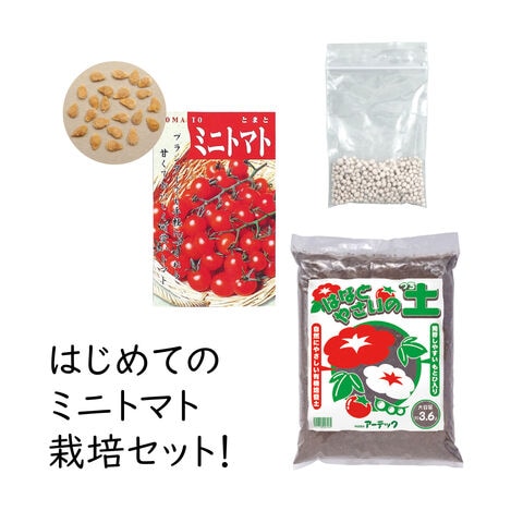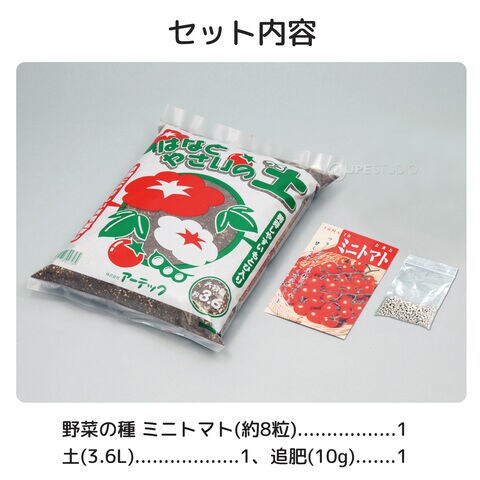 | セット内容 | 野菜の種 ミニトマト(約8粒)×1、土(3.6L)×1、追肥(10g)×1 |