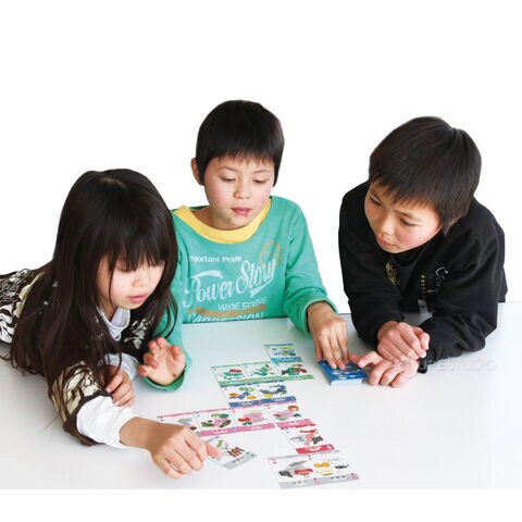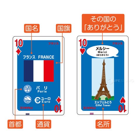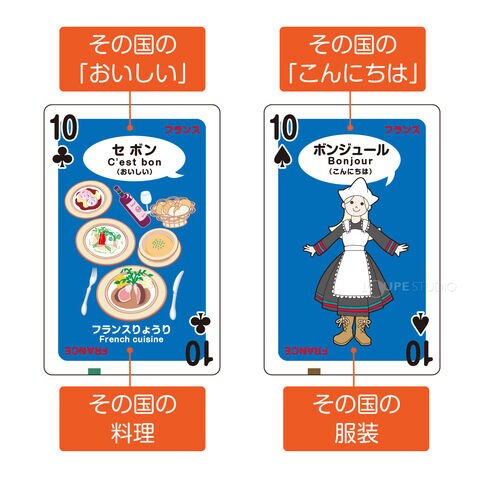 遊びながら国のことを覚えることができるかるたです。絵柄に国名や国旗、首都や通貨などの基本的な情報や、あいさつや名所、民族衣装などの文化が書かれています。13カ国、各国4種類のカードがあり、トランプだけではなくクイズなどの遊びもできます。