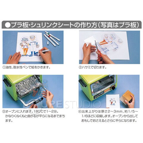 油性、耐水性ペンで絵を描いて、オーブントースターで焼いて仕上げます。オーブントースターで焼くと約1/5に収縮します。