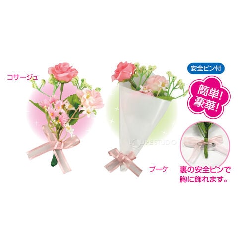 - 花を束ねてリボンをつけると、豪華で素敵なコサージュかブーケがつくれるキットです。