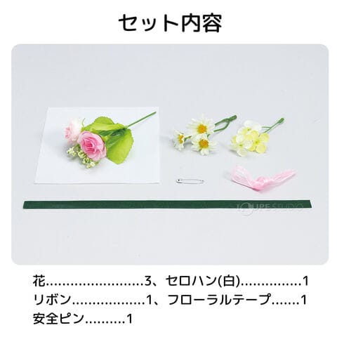 | セット内容 | 花×3、セロハン(白)×1、リボン×1、フローラルテープ×1、安全ピン×1 |