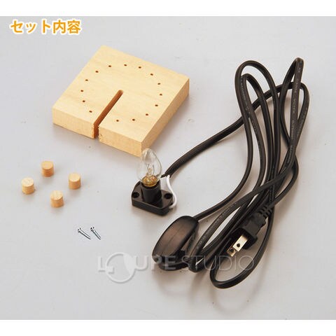 | セット内容 | 台板穴アケ加工×1、脚×4、電気ソケット付コード(中間スイッチ付)小×1、電球(ナツメ球)20W×1、木ネジ×2 |