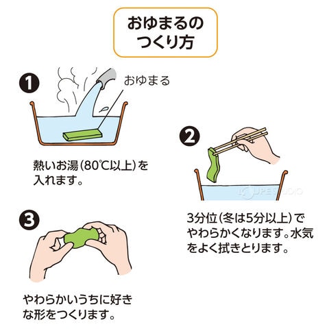 - 「おゆまる」は、80℃以上のお湯でやわらかくなる繰り返し使えるプラスチック粘土です。