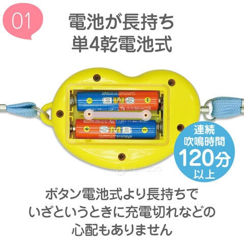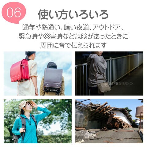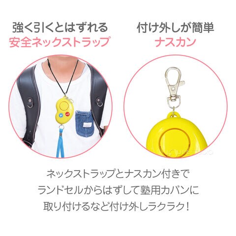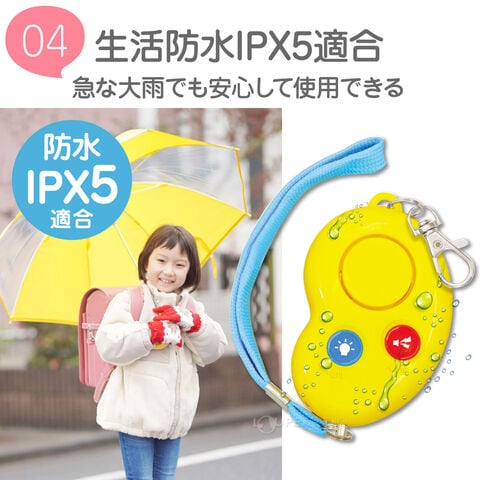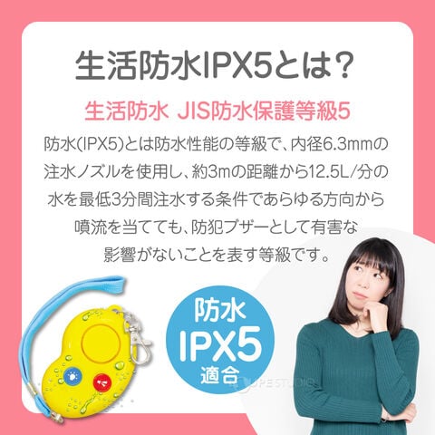 | その他 | (財)全国防犯協会連合会『優良防犯ブザー推奨品』『新基準適合商品』『防水IPX5適合』/※生活防水(IPX5)とは防水性能の等級で、内径6.3mmの注水ノズルを使用し、約3mの距離から12.5L/分の水を最低3分間注水する条件であらゆる方向から噴流を当てても、防犯ブザーとして有害な影響がないことを表す等級です。 |