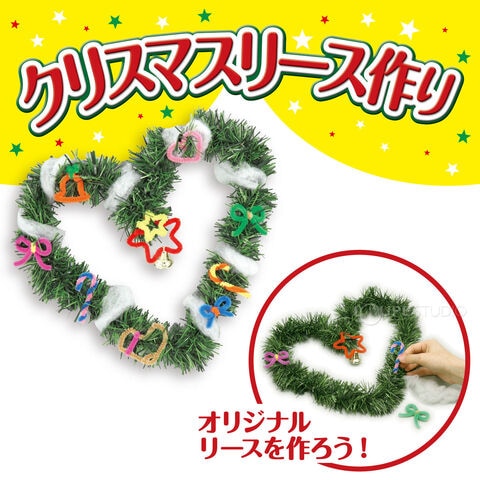 オリジナルのリースを作れるキットです。カラフルなモールと綿、ベルが付属しているので、簡単にかわいいリースが完成します。身近にある色紙や木の実、リボンなどを使って飾り付けするとさらにきれいです。