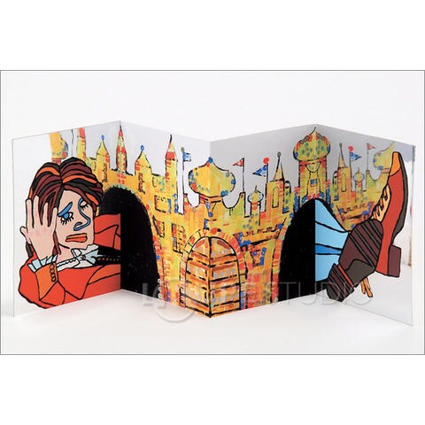 両端のミラーに描いた人物に、中央イラストの城壁映り込み、広がりと奥行きを創り出しています。