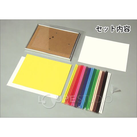 セット内容:のり付シート×1、タック付シート×1、メタリックフレーム×1、カラー砂13色組(4g×26本)×1、ミニジョウゴ×1