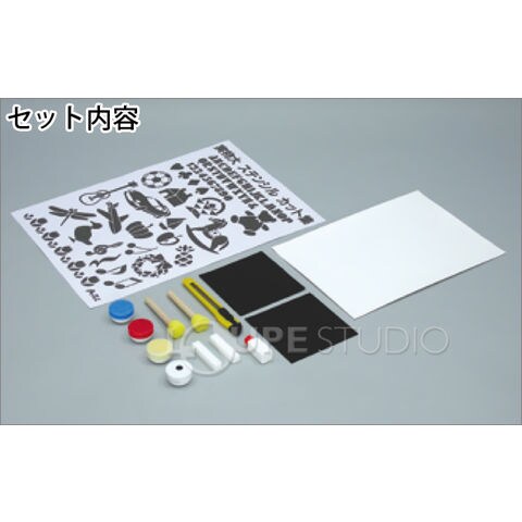 | セット内容 | インク(赤、青、黄、白、黒)×各1 型紙シール×1 スポンジタンポ×2 スポンジ×2 カーボン紙×2 実物大カット集×1 工作専用カッターナイフ×1 |