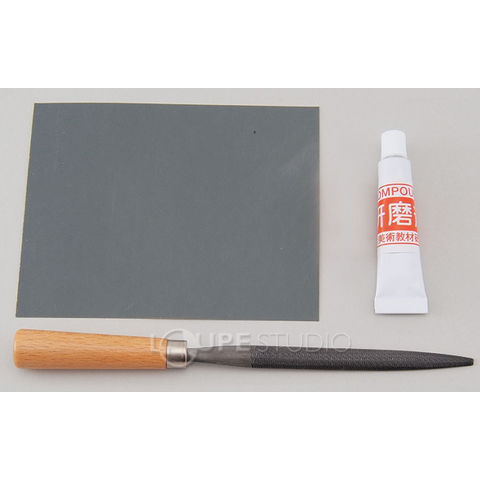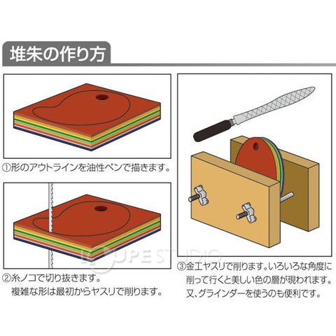 セット内容堆朱35×35mm角×1、金具×1、棒やすり×1、耐水ペーパー×1、コンパウンド(研磨剤)×1