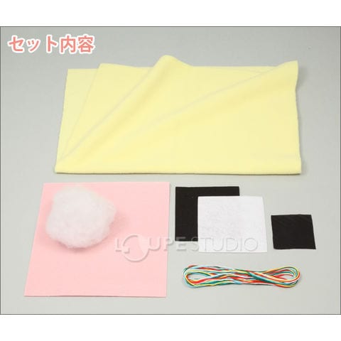 | セット内容 | フリース(黄)×1 、フェルト(3色 黒、白、ピンク)×各1 、布(黒)×1 、ししゅう糸(5色 白、黄、赤、緑、水)×1セット 、綿(約1g)×1 、説明書×1枚 、型紙×2枚 |