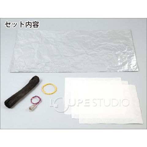 | セット内容 | 備長炭×1 ビニール導線(1m)×1 キッチンペーパー×3 アルミホイル25×50cm×1 豆電球(1.5V 0.11A)×1 ソケット×1 |