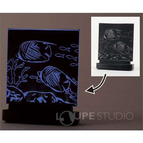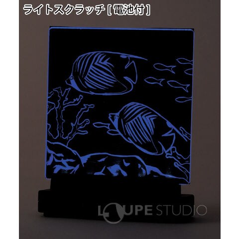 スイッチを入れると青い光に輝らされたスクラッチ部分が美しく浮かびあがります。