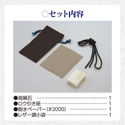 | セット内容 | 高蝋石(穴アケ加工)×1 皮ひも×1 型紙×1 耐水ペーパー×1 レザー製小袋×1 |
