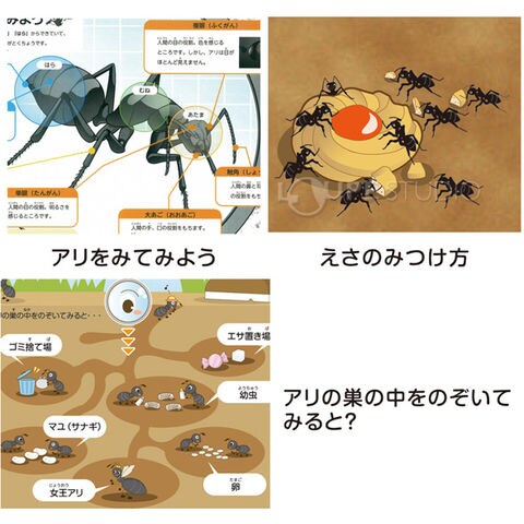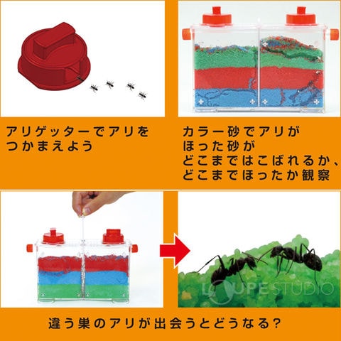 アリを捕獲し、巣作りの様子を観察します。専用のアリ捕獲器がついているので、簡単に生きのいいアリをつかまえることができます。つかまえたアリを使って、アリの好物やアリの戦いなどを見ることができます。