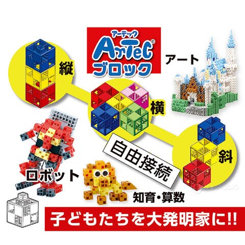 【「アーテックブロック」とは】日本で生まれた新しいブロックです。世界25ヵ国、日本全国4000箇所以上の幼稚園、保育園に採用!2014年にはグッド・トイ賞にも選ばれた安心の日本製ブロックです。子供から大人までずーっと遊べます。すべての面に穴があいた独自構造のブロック。全方向への連結が可能で、小さいお子さまでも、想像した形をどんどん形にしていけます。専用の電子パーツと組み合わせれば、オリジナルロボットの作成も可能(詳しくはサイトにて)。子供から大人まで、さまざまな遊び方ができる楽しいブロックです。