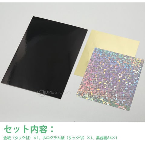 | セット内容 | 金紙(タック付)×1 ホログラム紙(タック付)×1、黒台紙A4×1 |