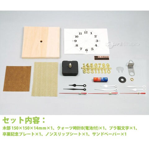 | セット内容 | 木部 150×150×14mm×1 クォーツ時計B(電池付)×1、プラ製文字×1 卒業記念プレート×1、ノンスリップシート×1 サンドペーパー×1 |
