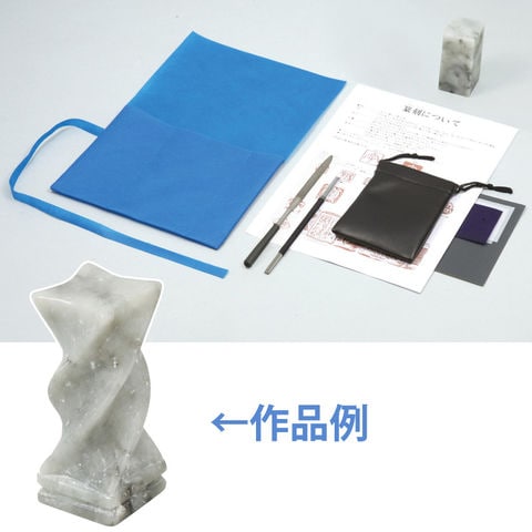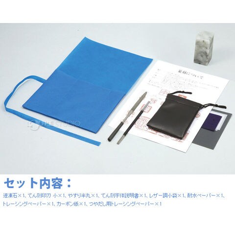 | セット内容 | 遼凍石×1、てん刻印刀 小×1 やすり半丸×1、てん刻字体説明書×1 レザー調小袋×1、耐水ペーパー×1 トレーシングペーパー×1、カーボン紙×1 つやだし用トレーシングペーパー×1 |