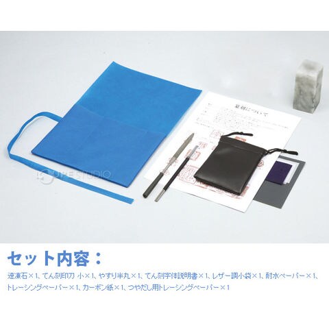 | セット内容 | 遼凍石×1、てん刻印刀 小×1 やすり半丸×1、てん刻字体説明書×1 レザー調小袋×1、耐水ペーパー×1 トレーシングペーパー×1、カーボン紙×1 つやだし用トレーシングペーパー×1 |