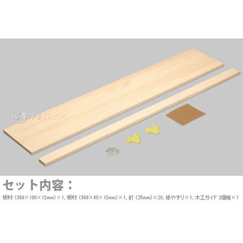| セット内容 | 板材 (900×180×12mm)×1、板材 (900×40×12mm)×1、釘 (25mm)×20、紙やすり×1、木工ガイド 2個組×1 |