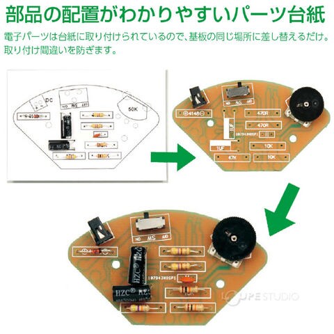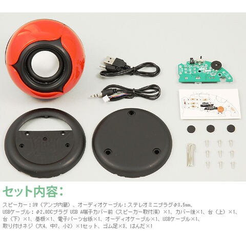 | セット内容 | スピーカー:3W(アンプ内蔵)、オーディオケーブル:ステレオミニプラグφ3.5mm、USBケーブル:φ2.0DCプラグ USB A端子カバー前(スピーカー取付済)×1、カバー後×1、台(上)×1、台(下)×1、基板×1、電子パーツ台紙×1、オーディオケーブル×1、USBケーブル×1、取り付けネジ(大4、中7、小2)×1セット、ゴム足×3、はんだ×1 |