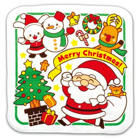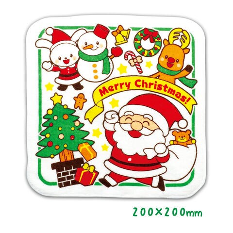 サンタクロースやトナカイが描かれたかわいいタオルハンカチです。クリスマスのプレゼントにおすすめです。綿100%。