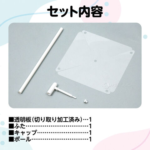 | セット内容 | 透明板(切り取り加工済み)(140×140mm)×1、ふた×1、キャップ×1、ポール(φ7×200mm)×1 |