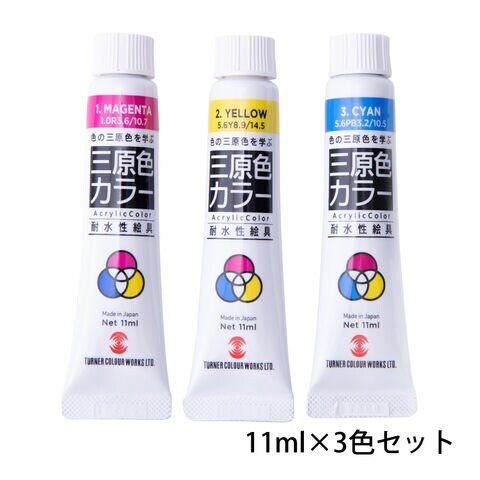 - ターナーの耐水三原色カラー(11ml)は、色の基本である三原色を使って、混色の楽しさや色彩の仕組みを学べる絵具です。