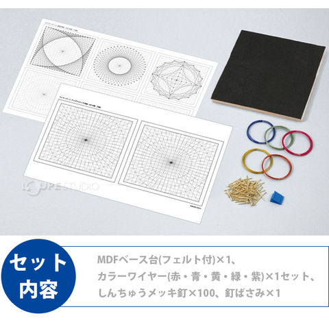 | セット内容 | MDFベース台(フェルト付)×1、カラーワイヤー(赤・青・黄・緑・紫)×1セット、しんちゅうメッキ釘×100、釘ばさみ×1 |