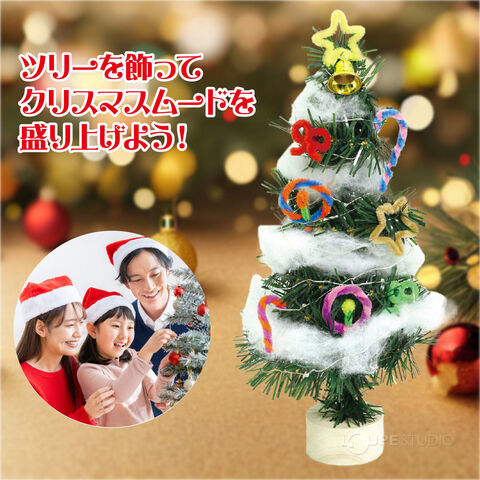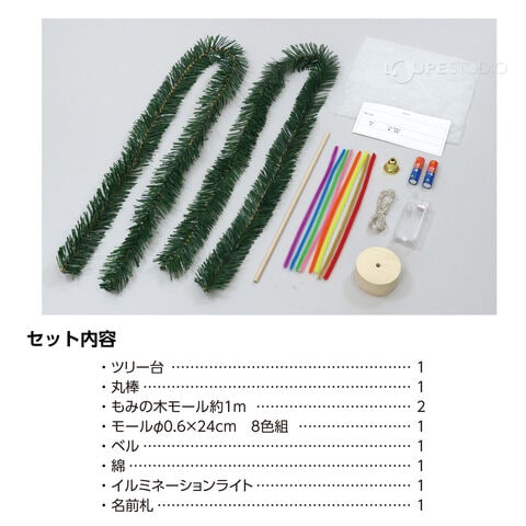 | セット部品 | もみの木モール(約1m)×2、モール(約φ0.6×24cm)8色組×1、ベル×1、ツリー台×1、丸棒×1、綿×1、イルミネーションライト×1 |