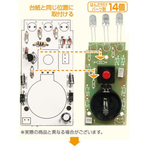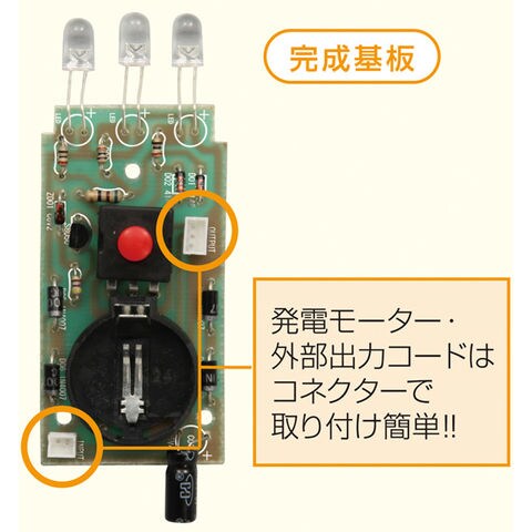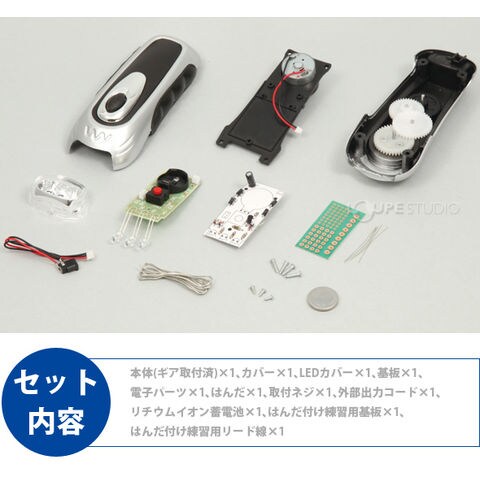 | セット内容 | 本体(ギア取付済)×1、カバー×1、LEDカバー×1、基板×1、電子パーツ×1、はんだ×1、取付ネジ×1、外部出力コード×1、リチウムイオン蓄電池×1、はんだ付け練習用基板×1、はんだ付け練習用リード線×1 |