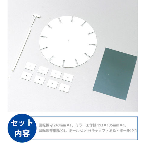 セット内容回転板 φ240mm×1、ミラー工作紙 193×135mm×1、回転調整用紙×8、ポールセット(キャップ・ふた・ポール)×1