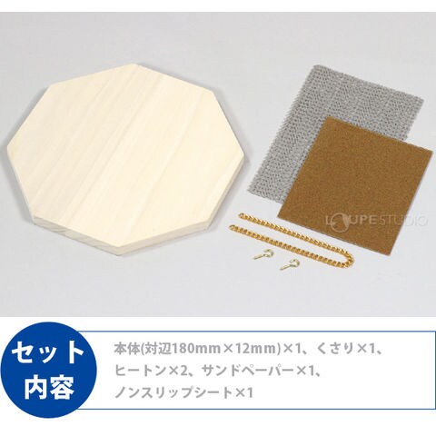 | セット内容 | 本体(対辺180mm×12mm)×1、くさり×1、ヒートン×2、サンドペーパー×1、ノンスリップシート×1 |