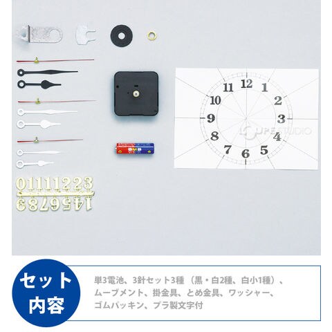 | セット内容 | 単3電池、3針セット3種 (黒・白2種、白小1種)、ムーブメント、掛金具、とめ金具、ワッシャー、ゴムパッキン、プラ製文字付 |