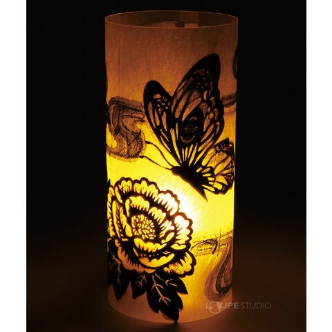 ランプは電池付。黒ラシャ紙で制作した切り絵や落ち葉などを、雲龍紙貼りPETシートにのり付けして円筒にしてランプをセットすると、美しい和紙のランプシェードができあがります。雲龍紙貼りPETシートに絵具で着色することもできます。